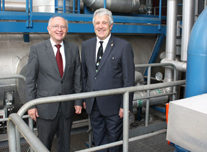 „Das Besondere an dem umweltfreundlichen Heizkraftwerk ist die ausschließliche Befeuerung mit Baum- und Strauchschnitt“, erklärte Franz Vogel und zeigte Peter Götz den in vier Segmente aufgeteilten Brennstoffbunker. Von dort aus gelangt die Biomasse – pro Tag werden rund 220 Tonnen benötigt - vollautomatisch über eine rotierende Walze auf die Kettenförderbänder. Ein Überlängenabscheider bearbeitet Material, das länger als 30 Zentimeter ist, und ein Magnet sortiert Eisenteile heraus. Anschließend gelangt die Biomasse in das Brennstoffsilo und von dort in die Mitte der Brennkammer.
