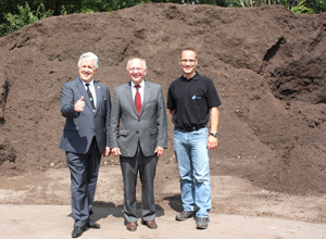 Götz zeigte sich beeindruckt von der kurzen Zeit von nur rund acht Wochen, die das Material bis zu seiner Fertigstellung benötigt. Geschäftsführer Schlien präsentierte dem CDU-Politiker den Grund dafür: „Die Natur selbst braucht beim Abbau von organischem Material mehrere Monate. Mit moderner Technik und unter kontrollierten Bedingungen lässt sich dieser Prozess jedoch optimieren und beschleunigen.“ Die Umweltpartner Vogel AG nutzt dafür eine Membranabdeckung aus GORETM. Unter der Plane entsteht das Klima, das die Mikroorganismen benötigen, um Abfälle in schnellstmöglicher Zeit in hochwertigen Kompost umzuwandeln. Zu den weiteren wesentlichen Bedingungen für einen schnellen Rottevorgang zählen ein ausgewogenes Nährstoffangebot mit einer Mischung von holzigem und nicht-holzigem Material, eine ausreichende Sauerstoffzufuhr sowie ein Feuchtigkeitsgehalt von rund 60 Prozent. Das vielfältige Produktportfolio der Vogel Umweltpartner AG umfasst neben dem Kompost in unterschiedlichen Körnungen auch Pflanzen- und Blumenerde, Rindenmulch sowie Gemische für spezielle Anforderungen wie etwa Sportplätze.