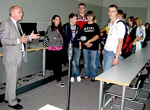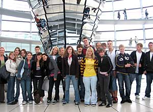 Beim Informationsbesuch im Reichstag diskutierten die Schüler lebhaft mit Peter Götz. Anschließend ließen sie sich von Götz den Fraktionssaals der CDU/CSU-Bundestagsfraktion auf der Fraktionsebene erläutern. Der Besuch endete mit der Besichtigung der Kuppel. Beispielhaft für die gestellten Aufgaben des Unterrichtsprojekts, wurde die imposante gläserne Kuppel in einem Gedicht dargestellt.
