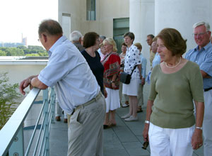Das Programm im Berliner Regierungsviertel begann mit einer fachkundigen Führung durch das Bundeskanzleramt. Die fast zweistündige Besichtigung führte u.a. durch das beeindruckende Foyer, auf die Pressekonferenzebene und in den Kabinettsaal. Die Gäste waren erfreut und erstaunt zugleich, Bundeskanzlerin Frau Dr. Angela Merkel persönlich zu sehen. Die Bundeskanzlerin empfing gerade eine Delegation hochrangiger Besucher.