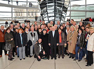 Zum Terminplan gehörten außerdem der Besuch der Ausstellung „Wege, Irrwege, Umwege – Die Entwicklung der parlamentarischen Demokratie“ im Deutschen Dom am Gendarmenmarkt und eine ausführliche Stadtrundfahrt. Die Teilnehmer konnten auch live und hautnah die Produktion des „ZDF-Morgenmagazins“ im ZDF-Hauptstadtstudio miterleben. Zum Informationsgespräch im Bundesministerium für Bildung und Forschung hatte Götz eine Überraschung für die Gäste vorbereitet: Bundesministerin Dr. Annette Schavan kam hinzu und nahm sich viel Zeit zum Gedankenaustausch. Hatte man sich noch beim Besuch der Landesvertretung Baden-Württemberg mit dem „Badener Lied“ verabschiedet, hieß es kurz darauf zahlreiche Sicherheitsvorkehrungen „durchzustehen“, bevor man das Bundeskanzleramt zur Besichtigungstour betreten konnte. Emotionaler Höhepunkt des Besuchsprogramms war am letzten Tag die Führung durch die Gedenkstätte Hohenschönhausen. Sichtlich bewegt erlebte man dort die Schilderungen eines Zeitzeugen über die Gräueltaten in der ehemaligen Untersuchungsanstalt des Ministeriums für Staatssicherheit.