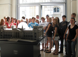 Anschließend gab es eine Führung durch das historische Gebäude. Dabei lernten sie die Plenarsaalebene kennen, von der aus die Bundestags- abgeordneten in den Plenarsaal gehen. Dort stehen verschiedene anschauliche Modelle vom Reichstagsgebäude, von der Kuppel und von der Stadt Berlin. Auf dieser Ebene liegt auch ein Andachtsraum, in dem vor Plenarsitzungen kurze Andachten gehalten werden. Die Fraktionsebene und die Besichtung der Kuppel durften natürlich bei diesem Rundgang nicht fehlen. Abschließend stärkten sich die Schüler bei einem Mittagessen im Besucherrestaurant im Paul-Löbe-Haus.