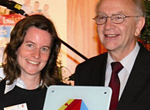 MdB Peter Götz übergibt im Auftrag der Familienministerin Dr. Ursula van der Leyen bei der Auftaktveranstaltung im Mehrgenerationenhaus Rastatt das Hausschild an die Leiterin Byrte Mayland.