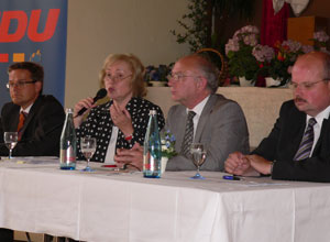 Podium mit Stadtverbandsvor- sitzender Björn Sucher, Professor Dr. Maria Böhmer, MdB Peter Götz,