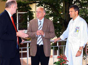Götz informierte sich im Gespräch mit Jürgen Jung (l.) und Dr. Bernhard Kern (r.) über die Arbeit der Palliativstation auf der Hub. Das Bild entstand auf einem der großen Balkone, auf denen auch bettlägerige Patienten bei schönem Wetter frische Luft tanken können.