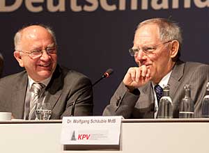Unter großem Beifall der Delegierten wurde Dr. Schäuble begrüßt. Der Bundesfinanzminister betonte, dass die Finanzsituation des Bundes nach der Steuerschätzung zwar besser als erwartet sei, aber die Neuverschuldung dennoch extrem hoch sei.