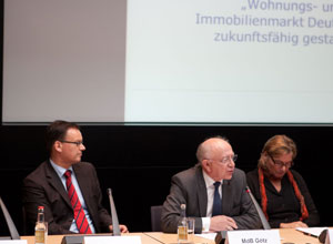 Unter der Moderation von Christof Hardebusch wurden vor allem Fragen des Wohnungsmarktes und der energetischen Sanierung des Gebäudebestandes diskutiert. Die Podiumsdiskussion fand im Rahmen des "Immobilienwirtschaftlichen Dialogs" im Bundesministerium für Verkehr, Bau und Stadtentwicklung statt.