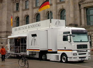 Informationsmaterial wird zum Mitnehmen und Informieren ausreichend vorhanden sein. Für die Betreuung der Besucherinnen und Besucher des Infomobils stehen des weiteren Mitarbeiter des Referates Öffentlichkeitsarbeit des Deutschen Bundestages bereit.
